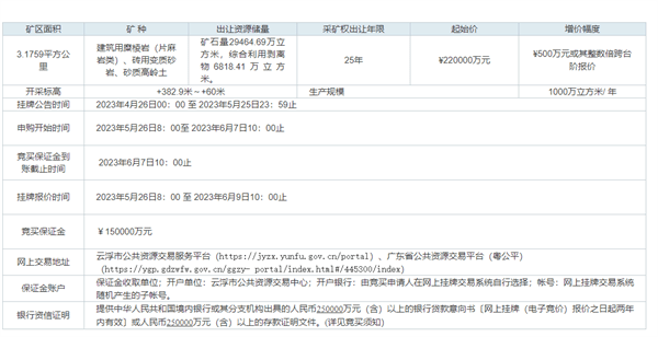 2023年2月, 廣東云浮出讓牛欄坑礦資源儲(chǔ)量1.48億方、規(guī)劃年產(chǎn)能850萬(wàn)方,成交金額32億元。