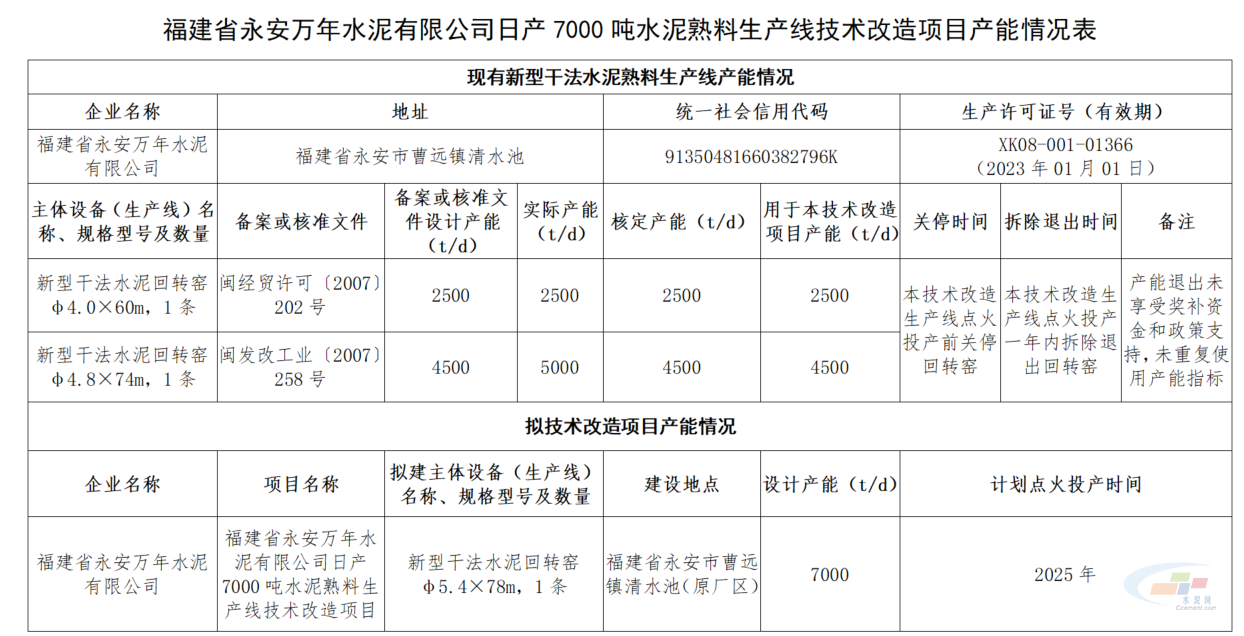 6月18日,福建省工信廳發(fā)布了關(guān)于福建省永安萬年水泥有限公司日產(chǎn)7000噸水泥熟料生產(chǎn)線技術(shù)改造項(xiàng)目產(chǎn)能情況的公示。公示期為2021年6月18日至2021年6月24日(5個工作日)。
